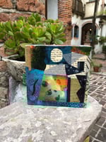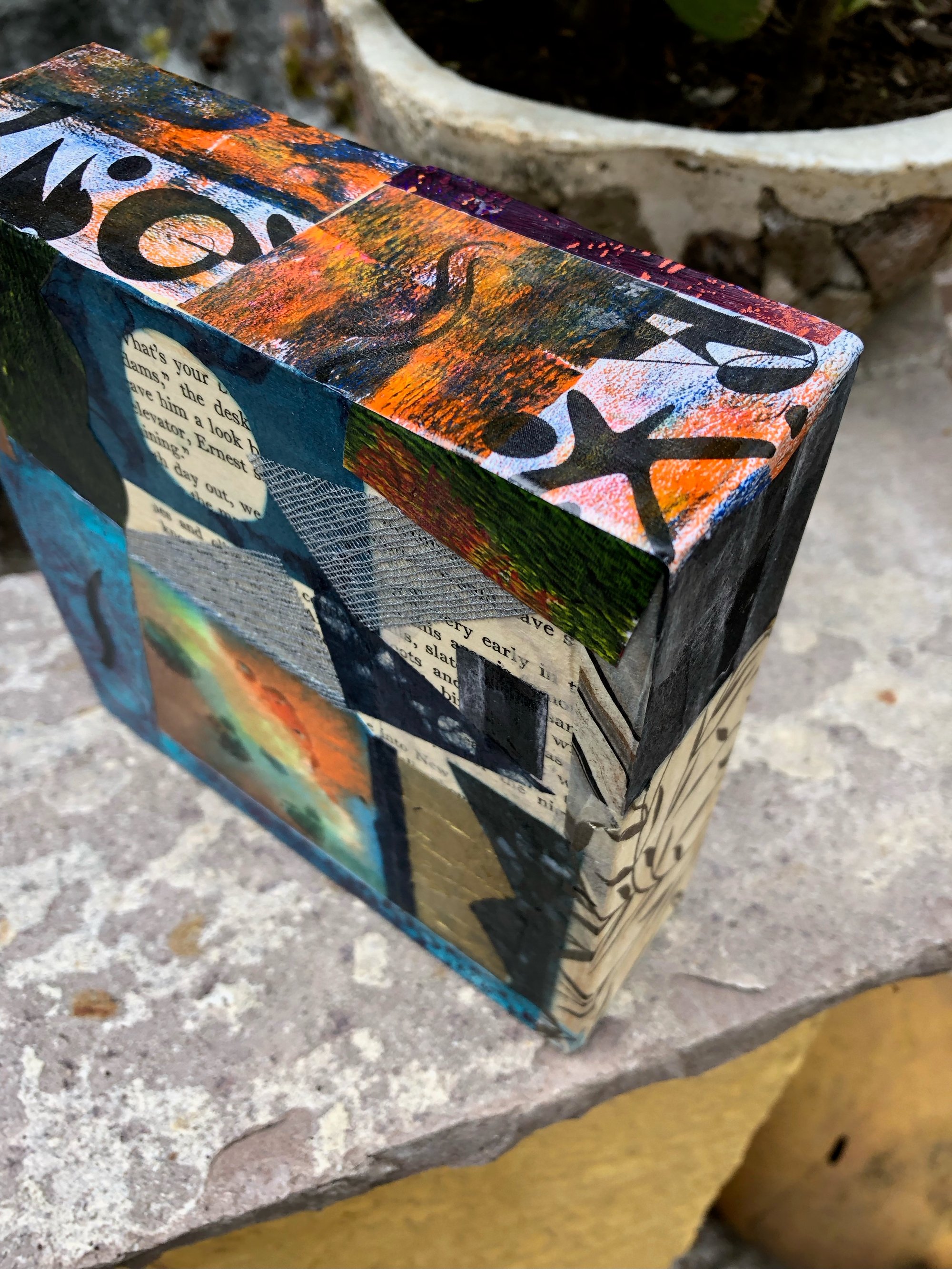 Original work, collage - acrylic on paper, collage on 6"x6"x2" wood canvas.